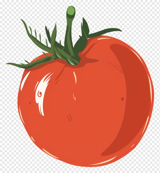Download this vibrant, high-quality PNG image of a fresh, ripe red tomato with its green stem and leaves for free! Perfect for adding a splash of color and healthy appeal to your culinary projects, food blogs, recipe designs, or educational content. This juicy, cartoon-style illustration features subtle highlights and a transparent background, making it easy to integrate into any design. Ideal for menus, grocery flyers, gardening themes, or graphic compositions. Get your free transparent tomato clipart today and enhance your designs instantly!
