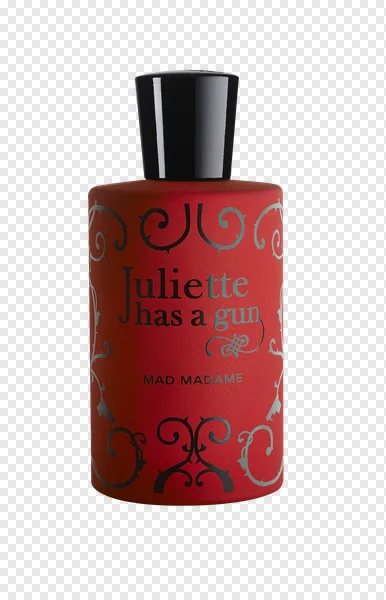 Download a high-quality, transparent PNG image of the Juliette Has a Gun Mad Madame perfume bottle. Perfect for graphic design, product mockups, website visuals, or social media content. This free-to-use image features the iconic red bottle with elegant teal accents and branding. Enhance your projects with this beautiful and versatile perfume graphic! No attribution required.