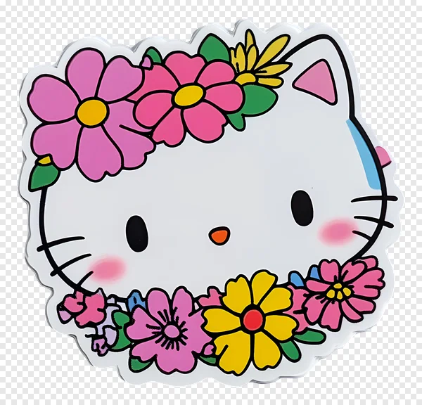 Download this charming Hello Kitty PNG for free, featuring the iconic character adorned with a beautiful flower crown on her head and a vibrant floral lei around her neck. This cute, kawaii cartoon image showcases Hello Kitty with an array of pink, yellow, and green flowers, perfect for adding a touch of sweetness and cheer to your digital designs, scrapbooking, stickers, invitations, or crafts. Get this transparent floral Hello Kitty clip art to instantly elevate your next creative project with its joyful and adorable aesthetic. Ideal for spring, summer, and any occasion needing a touch of cuteness!
