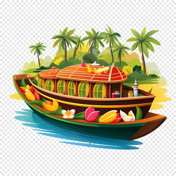 Download this beautiful Kerala houseboat PNG image for free! Featuring a traditional Kettuvallam boat gliding through tranquil backwaters, surrounded by lush palm trees and vibrant tropical flowers. Perfect for travel blogs, vacation graphics, Kerala tourism designs, or adding a touch of exotic paradise to your projects. High-resolution and transparent background for easy integration. Get your free download now!