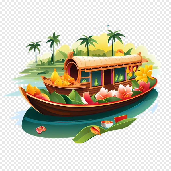 Download this beautiful Kerala houseboat PNG image for free! Featuring a traditional Kettuvallam boat gliding through serene backwaters, lush palm trees, and vibrant lotus flowers. Perfect for travel blogs, website backgrounds, illustrations, or any project needing a touch of South Indian paradise. High-resolution and transparent background for easy integration. Get your free download now!