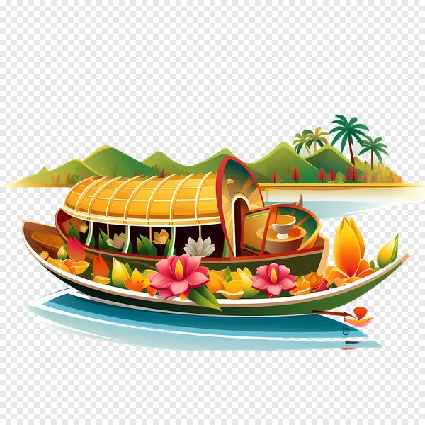 Download this beautiful Kerala houseboat PNG image for free! Featuring a traditional Kettuvallam boat gliding through serene backwaters, lush tropical landscapes, and vibrant flowers. Perfect for travel blogs, Kerala tourism designs, vacation graphics, or adding a touch of exotic beauty to your projects. High-resolution and transparent background for easy integration. Get your free download now!