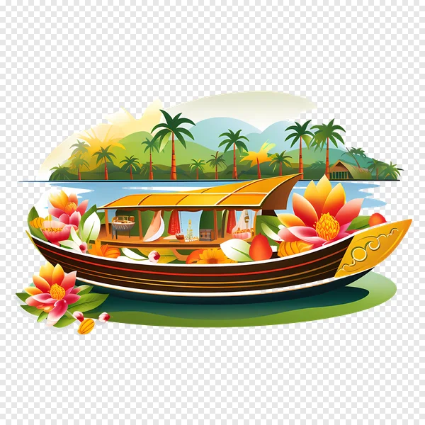 Download this stunning Kerala houseboat PNG image for free! Featuring a beautifully illustrated traditional houseboat floating on tranquil backwaters, surrounded by lush palm trees and vibrant tropical flowers. Perfect for travel blogs, website backgrounds, presentations, or any project needing a touch of exotic Kerala scenery. High-resolution and transparent background for easy integration. Get your free download now!