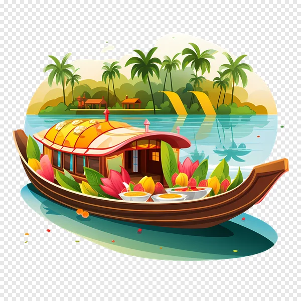 Download this beautiful Kerala houseboat PNG image for free! Featuring a vibrant illustration of a traditional Kettuvallam boat gliding through serene backwaters, lush palm trees, and charming village houses. Perfect for travel blogs, website backgrounds, presentations, or any project needing a touch of tropical paradise. High-resolution and transparent background for easy integration. Get your free download now!