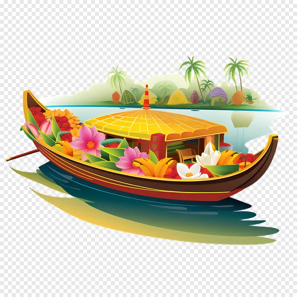 Download this stunning Kerala houseboat PNG image for free! Featuring a beautifully decorated traditional boat overflowing with vibrant tropical flowers, lush palm trees, and a serene waterscape. Perfect for travel blogs, Kerala tourism designs, vacation graphics, or adding a touch of exotic beauty to your projects. High-resolution and transparent background for easy integration. Get your free download now!