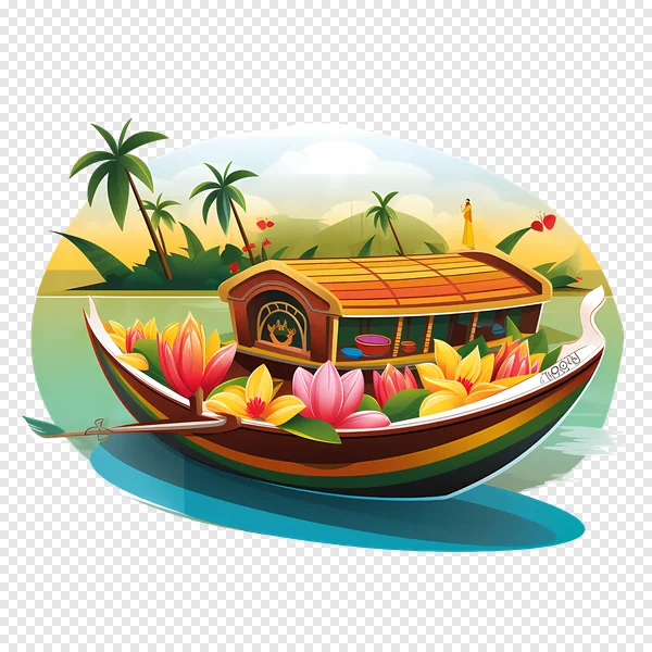 Download this beautiful Kerala houseboat PNG image for free! Featuring a vibrant illustration of a traditional Indian houseboat (Kettuvallam) on tranquil waters, surrounded by lush palm trees and tropical flowers. Perfect for travel blogs, website backgrounds, presentations, or any project needing a touch of South Indian charm. High-resolution, transparent background for easy integration. Enhance your designs with this stunning Kerala scenery!