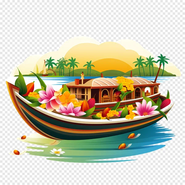 Download this stunning, high-quality PNG image of a traditional Kerala houseboat floating on tranquil waters under a vibrant sunset. Perfect for travel blogs, website backgrounds, graphic design projects, or adding a touch of exotic beauty to your work. This free PNG features lush tropical foliage, a serene coastal landscape, and a beautifully detailed houseboat. Enhance your designs with this captivating Kerala-inspired graphic – download now!