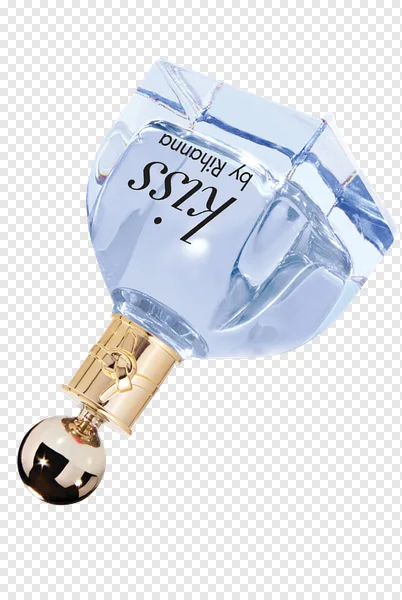 Download a stunning, high-quality PNG of the iconic 'Kiss by Rihanna' perfume bottle for free! This captivating image showcases the elegant faceted clear glass bottle with its soft light blue tint, paired beautifully with a luxurious gold metallic cap featuring a delicate ribbon design and a shiny silver spherical base. Ideal for beauty blogs, e-commerce product listings, graphic design projects, or enhancing any digital content. Get this transparent background image to add a touch of celebrity fragrance sophistication to your creations without any cost.