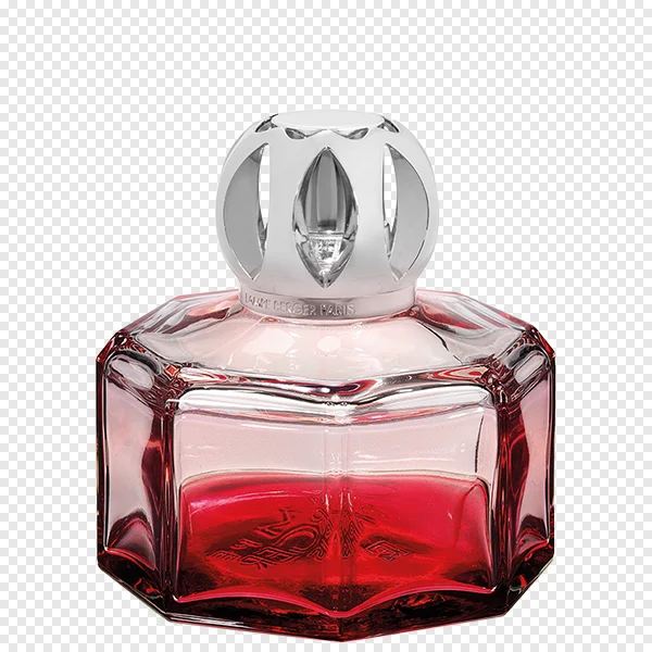 Download this exquisite Lampe Berger Paris catalytic lamp PNG image for free. This high-quality transparent PNG showcases a stylish hexagonal clear glass bottle filled with a vibrant red fragrance, topped with an ornate silver metallic cap bearing the iconic "LAMPE BERGER PARIS" inscription. Perfect for graphic design projects, e-commerce listings, blog posts about home decor, luxury goods, or aromatherapy. Enhance your visuals with this elegant air purifying and scent diffusing object, ready for instant download to add a touch of sophistication to any creative work.