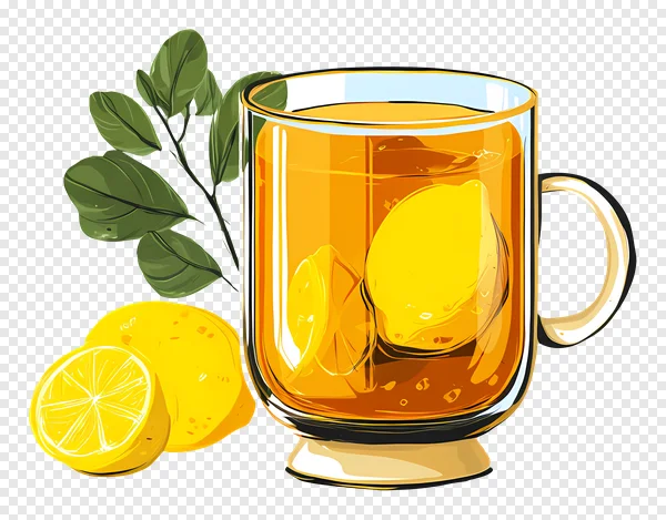 Download this beautiful lemon tea PNG image for free! Featuring a vibrant illustration of a glass mug filled with hot tea and lemon slices, alongside whole and halved lemons with fresh leaves. Perfect for websites, blogs, presentations, or any project needing a refreshing and healthy beverage graphic. High-resolution and transparent background for easy integration. Get your free download now!