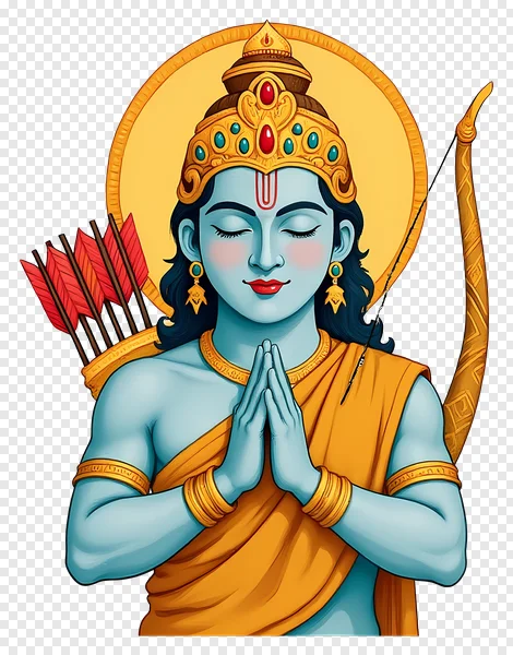 Tags: Anjali Mudra Ayodhya Deity Hindu God Hindu mythology Lord Ram Namaste Ram Lalla Rama blue skin bow and arrow devotion divine golden crown halo meditation mukut orange dhoti quiver red arrows religious festival spiritual transparent PNG worship