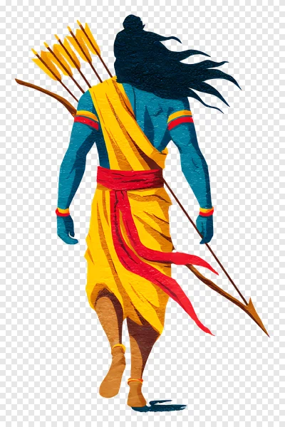 Immerse yourself in divine strength with this captivating free PNG of Lord Rama. This unique illustration showcases the revered Hindu deity with his iconic blue skin, flowing yellow attire, and a vibrant red sash, walking resolutely with a quiver of golden arrows and a powerful bow slung across his back. The artistic texture and stark black background make this image truly stand out. Perfect for enhancing your designs for Hindu festivals like Diwali and Dussehra, cultural projects, religious presentations, or adding a touch of spiritual and mythological elegance to any creative work. Download this high-quality, transparent PNG image now to bring the valor and grace of Lord Rama to your creations.