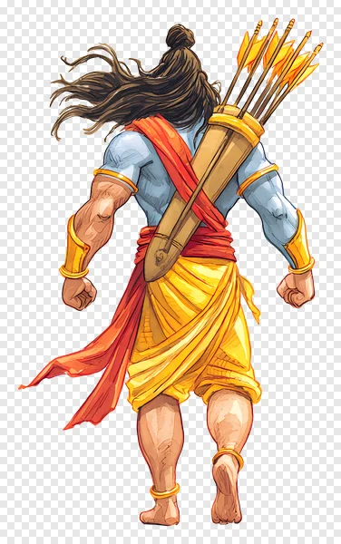 Download this powerful free PNG of Lord Rama, the revered Hindu deity and warrior, depicted majestically from behind. This stunning illustration showcases his iconic blue-tinged skin, flowing dark hair, and traditional attire, complete with a golden quiver overflowing with arrows. Perfect for religious projects, cultural presentations, graphic design, or adding a touch of ancient Indian mythology to your digital artwork. The transparent background makes integration seamless. Get this high-quality Lord Rama warrior image for your creative endeavors today!