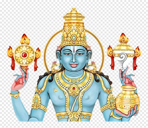 Discover a stunning, high-quality PNG of Lord Vishnu, the preserver deity in Hinduism. This beautiful illustration features the blue-skinned god adorned with a majestic golden crown and intricate jewelry, gracefully holding his divine attributes: the powerful Chakra (disc), sacred Shankha (conch shell), and auspicious Kalasha (pot). Perfect for spiritual graphics, cultural presentations, religious art, or any project needing a majestic Hindu deity. Download this transparent background image for free and elevate your designs with divine grace and rich symbolism. Ideal for devotees, designers, and educators seeking authentic Hindu iconography.
