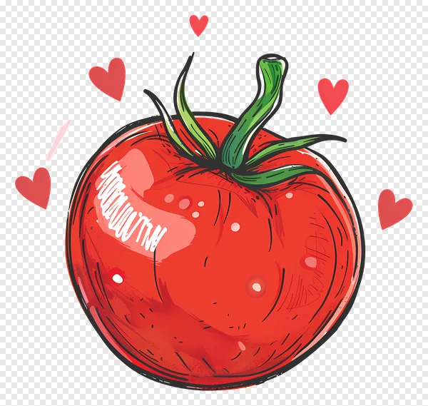 Download this adorable free hand-drawn tomato PNG with a transparent background! This vibrant red tomato illustration features a fresh green stem and is surrounded by charming floating red hearts, symbolizing a love for healthy eating and fresh produce. Perfect for culinary blogs, recipe cards, healthy lifestyle websites, restaurant menus, kids' educational materials, or any graphic design project needing a touch of fresh, organic goodness and playful charm. Get this unique doodle art vegetable image for your creative projects today!