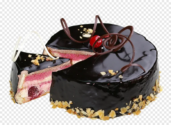 Indulge your senses with this exquisite chocolate cherry almond cake PNG. This high-quality image features a decadent round cake covered in a rich, glossy dark chocolate glaze, elegantly decorated with chocolate curls, a vibrant red cherry, and crunchy almond flakes. A perfectly cut slice reveals alluring layers of fluffy sponge, creamy pink mousse, and a juicy dark cherry at its heart. Ideal for dessert menus, bakery promotions, food blogs, birthday invitations, or any design project requiring a touch of gourmet sweetness. Download this free transparent background PNG to add a sophisticated and delicious visual element to your creations!