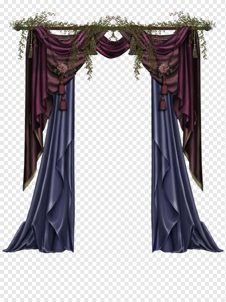 Download this stunning free PNG of an elegant curtains archway, perfect for adding a touch of sophistication to your creative projects. This luxurious graphic features rich, flowing deep purple and dusty blue drapery, beautifully adorned with a lush floral swag of green vines and delicate pink blossoms. Ornate tassels and a prominent central rose medallion complete the opulent, romantic look. Ideal for wedding invitations, event backdrops, digital scrapbooking, fantasy art, stage designs, or any project needing a regal, romantic, or theatrical frame. The transparent background ensures easy integration into your designs. Enhance your next visual endeavor with this exquisite, high-quality decorative element.