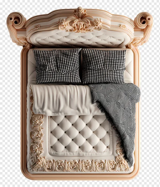 Download this stunning high-resolution PNG image of a luxurious baroque-style bed. Perfect for interior design projects, furniture catalogs, or any project requiring a touch of elegance. The image features intricate carvings, cream-colored upholstery, and stylish black and white bedding. Enhance your designs with this exquisite detail – download now for free!
