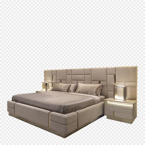 Download this stunning high-resolution PNG image of a luxurious beige upholstered bed with a geometric headboard and matching nightstands. Perfect for interior design websites, brochures, catalogs, or any project needing a sophisticated bedroom image. The image features crisp details, making it ideal for high-quality printing and digital use. Download now and elevate your design projects!