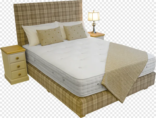 Download this stunning high-resolution PNG image of a luxurious beige bedroom setting. Featuring a plush mattress, plaid headboard, and stylish bedside table, this image is perfect for interior design websites, brochures, or any project needing a touch of elegance. The crisp details and neutral color palette make it incredibly versatile. Enhance your designs with this free, high-quality PNG – download now!