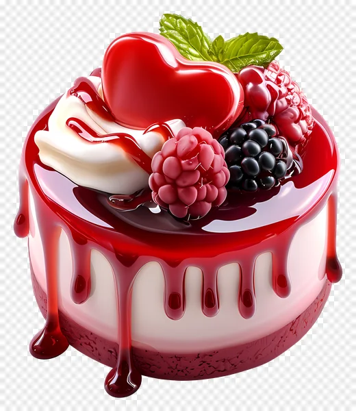 Download this exquisite PNG image of a delectable berry drip cake, perfect for romantic occasions, Valentine's Day, or any sweet celebration. Featuring a glossy red heart, fresh raspberries, juicy blackberries, and vibrant mint leaves, all beautifully drizzled with rich red glaze. The cake sits elegantly on a black background, making it ideal for graphic design projects, invitations, social media posts, or website banners. Get this high-quality, isolated dessert PNG for free today!