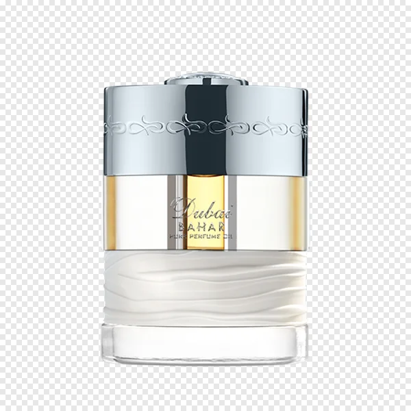 Discover the exquisite 'Dubai Bahar Pure Perfume Oil' bottle, a symbol of Arabian luxury. This high-quality PNG features a sleek silver cap with ornate detailing, a transparent section showcasing the rich golden oil, and a distinctive wavy white base. Perfect for enhancing beauty product mockups, e-commerce listings, graphic design projects, or luxury lifestyle content. Download this transparent, free PNG image to add a touch of elegance and sophistication to your digital creations. Ideal for designers, bloggers, and marketers seeking premium fragrance visuals.