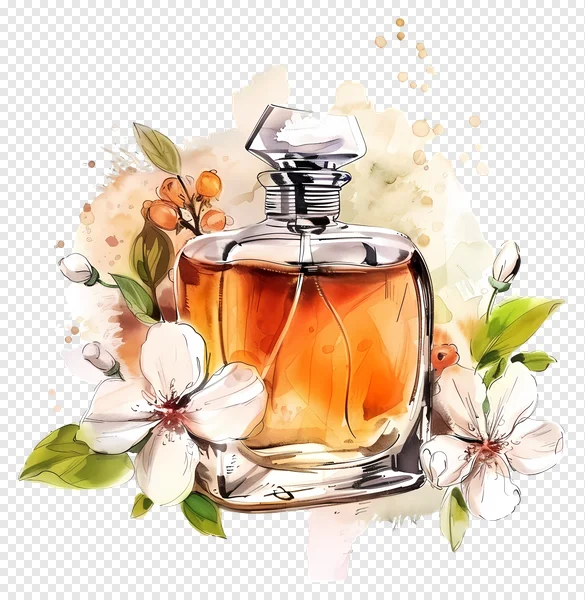 Download this exquisite watercolor perfume bottle PNG for free! Featuring an elegant, clear glass bottle filled with rich amber liquid, beautifully adorned with delicate white flowers, vibrant green leaves, and charming orange berries. The artistic watercolor splash background adds a touch of sophistication and natural beauty. This high-quality, transparent background illustration is perfect for beauty blogs, cosmetic advertisements, personal projects, digital art, social media content, or any design needing a touch of luxury and floral essence. Enhance your creative projects with this stunning, freely available graphic now!