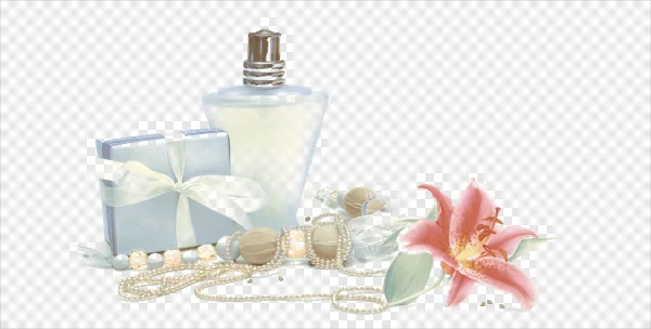 Tags: anniversary beauty celebration elegant feminine floral fragrance frosted perfume gift box jewelry light blue gift lily flower luxury pearl necklace pearls perfume bottle pink lily present romance special occasion transparent PNG white ribbon
