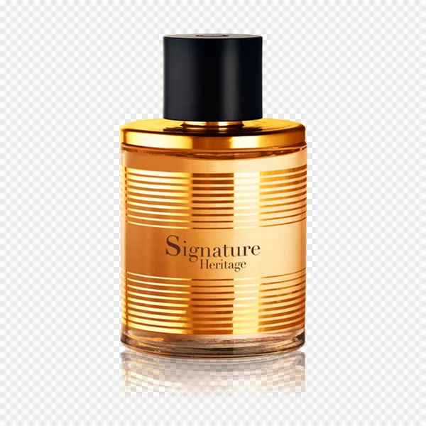 Elevate your designs with this stunning free PNG of a luxury gold perfume bottle. Featuring the elegant 'Signature Heritage' label, intricate horizontal stripes, and a sleek black cap, this high-quality image is perfect for showcasing premium fragrances. Download this transparent background PNG to enhance your product mockups, beauty blogs, marketing materials, or personal creative projects. Its sophisticated aesthetic makes it ideal for digital and print media, adding a touch of golden opulence to any design. Get your free download now!
