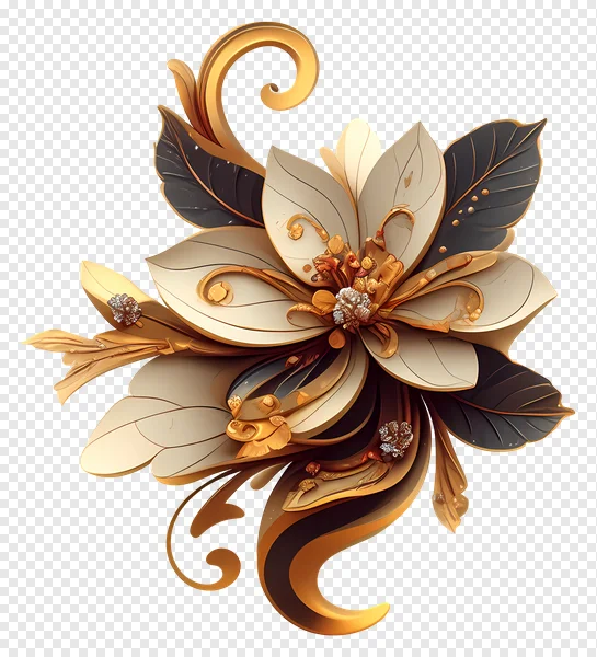 Download this exquisite, free PNG of a luxury golden floral design, perfect for adding a touch of sophistication to any project. This ornate illustration features a multi-layered flower with shimmering cream and deep black petals, highlighted by intricate golden swirls and sparkling diamond-like jewels. With its high-quality detailing and transparent background, it's ideal for elegant invitations, opulent branding, digital art, scrapbooking, wedding designs, and any creative endeavor needing a glamorous flourish. Get your free download today and elevate your design work instantly!