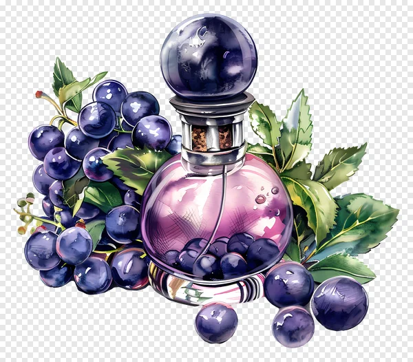 Discover a captivating PNG illustration featuring a luxurious purple grape perfume bottle, exquisitely detailed with glossy grapes and vibrant green leaves. This stunning artwork, set against a dramatic black background, evokes a sense of elegance and natural fragrance. The watercolor-style rendition offers a unique, artistic touch. Perfect for enhancing your graphic design projects, presentations, or website content. Download this high-quality, transparent PNG for free and add a touch of sophisticated, fruit-inspired beauty to your creative work, ideal for cosmetic brands, food blogs, or lifestyle content.