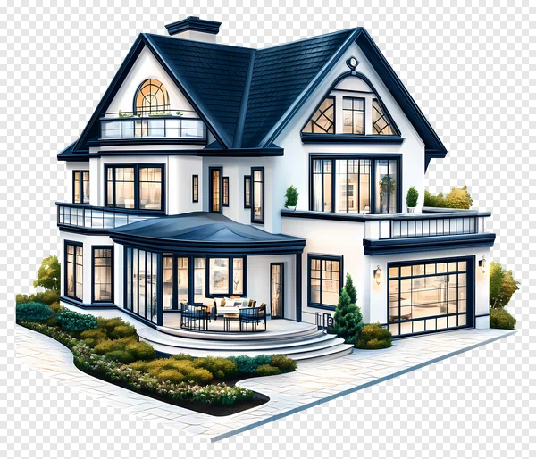 Download this stunning free PNG image of a luxury modern house, perfect for architectural visualization, real estate presentations, or graphic design projects. This elegant two-story home features a pristine white facade, a sophisticated dark blue roof, and expansive windows that illuminate warm, inviting interiors. Complete with multiple balconies, a spacious outdoor patio with stylish seating, and beautifully manicured garden beds, it captures the essence of contemporary upscale living. The isolated transparent background makes it easy to integrate into any creative work. Get your free high-quality residential building PNG today!