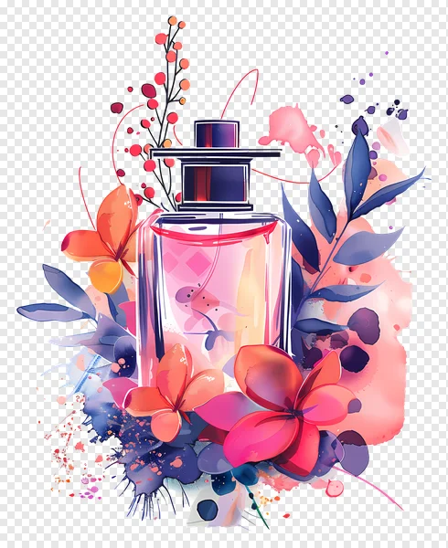 Download this exquisite free PNG featuring a luxury perfume bottle rendered in a captivating watercolor style. This vibrant illustration showcases a stunning pink perfume bottle surrounded by artistic floral elements, abstract blue and purple leaves, red berries, and dynamic paint splashes in various shades of pink, coral, and blue. The transparent background makes it perfect for seamless integration into your design projects. Ideal for beauty blogs, cosmetic branding, digital art, social media posts, or any creative endeavor needing an elegant, high-quality visual. Get this high-resolution, unique artwork instantly for free!