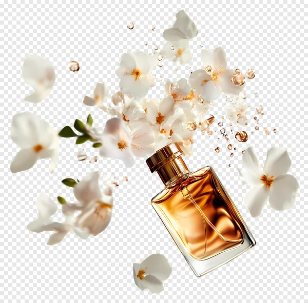Download this stunning high-quality PNG of a luxurious golden perfume bottle surrounded by elegant white flowers and sparkling golden droplets, all set against a sleek black background. Perfect for beauty, cosmetic, or fashion brands, advertising campaigns, website design, product mockups, and more. This vibrant and ethereal image evokes freshness, sophistication, and a captivating fragrance. Enhance your creative projects with this free, transparent background PNG today!