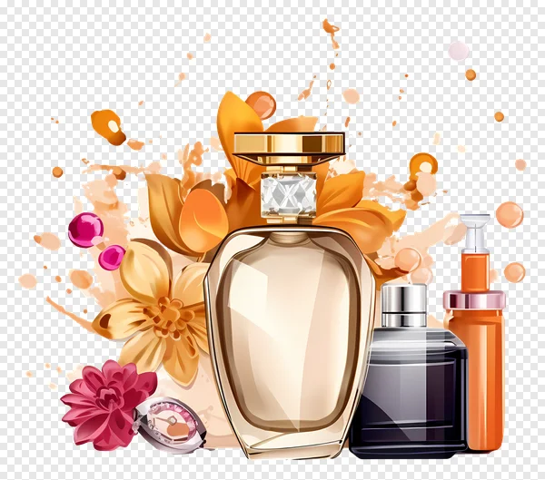 Download this exquisite free PNG featuring a collection of luxury perfume and cosmetic bottles. The centerpiece is a radiant golden amber fragrance bottle, complemented by a sleek dark purple cologne and a vibrant orange pump spray bottle. Adorned with elegant golden and rich pink floral accents, dynamic abstract splashes, and subtle glittering details against a striking black background, this high-quality transparent image is perfect for beauty blogs, product promotions, graphic design projects, website banners, or social media posts. Elevate your creative work with this sophisticated and glamorous illustration. Free for personal and commercial use!