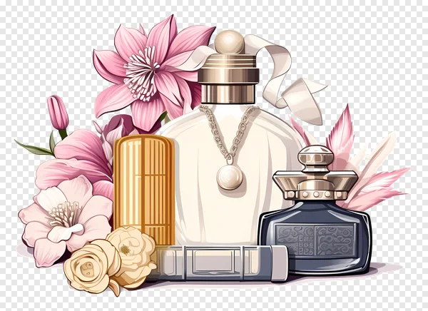 Discover our exquisite free PNG of luxury perfume bottles surrounded by delicate pink and cream flowers. This high-resolution image offers a sophisticated blend of beauty and elegance, showcasing various fragrance designs including a chic white bottle with a pearl necklace, a golden cylindrical spray, a dark blue ornate bottle, and a sleek clear one. Ideal for designers, marketers, and enthusiasts looking for premium, transparent assets for beauty, fashion, and lifestyle content. Enhance your projects with this glamorous floral scent collection – absolutely free to download for commercial and personal use!