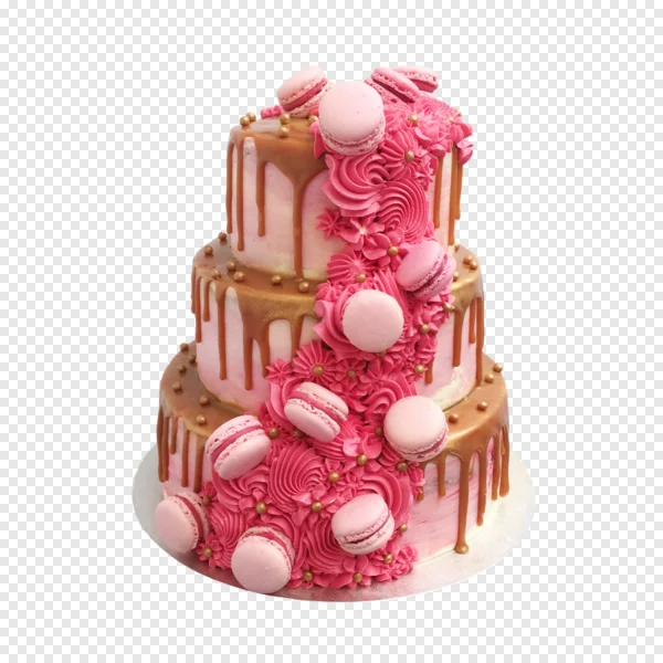 Download this stunning, high-quality free PNG image of an elegant three-tiered pink cake. Adorned with delicate pink macarons, luxurious gold drip frosting, and intricate floral piping details, this celebratory dessert is perfect for enhancing your graphic design projects. Ideal for invitations, menus, websites, social media posts, or any digital content related to weddings, birthdays, anniversaries, or any special event. Get this beautiful, transparent background cake image instantly for your creative needs!