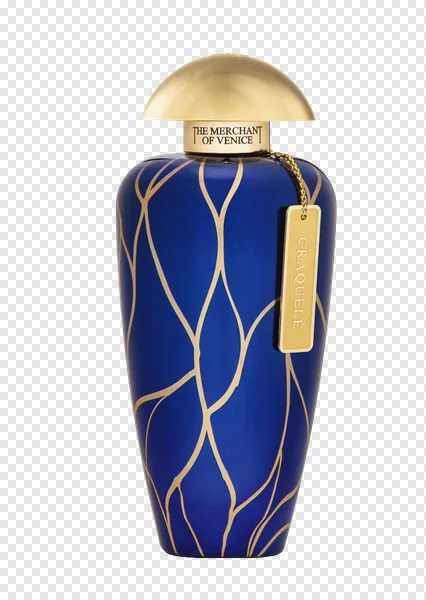 Discover this exquisite free PNG of The Merchant of Venice Craquelé perfume bottle. This high-quality, isolated image showcases a stunning deep cobalt blue bottle adorned with intricate golden crackle-effect lines and a luxurious, dome-shaped gold cap. Ideal for e-commerce product listings, beauty blogs, graphic design projects, presentations, or luxury fashion advertisements. Download this unique and detailed fragrance bottle to add a touch of sophistication and elegance to your creative work, perfect for showcasing high-end cosmetic products. Enhance your visual content with this instantly available free download.