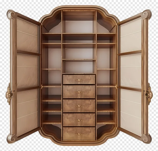 Download a high-quality, transparent PNG image of a luxurious, open wardrobe. This elegant cabinet features detailed wood grain, ornate detailing, and multiple shelves and drawers. Perfect for interior design projects, visualizations, or adding a touch of sophistication to your digital artwork. Get this free PNG now and enhance your creative work! Use it for mockups, presentations, or website graphics. No attribution required.