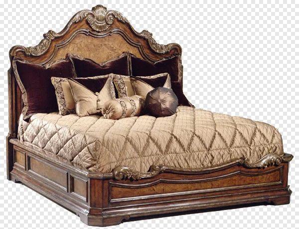 Download this stunning high-resolution PNG image of a luxurious wooden bed with intricate carvings and elegant bedding. Perfect for interior design projects, furniture catalogs, or any project needing a touch of opulent style. The image features a detailed headboard, plush pillows, and a rich, dark wood finish. Download now for free and elevate your designs!