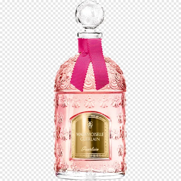 Download a high-quality, transparent PNG image of the exquisite Mademoiselle Guerlain perfume bottle. Perfect for graphic design projects, presentations, website visuals, or adding a touch of luxury to your creations. This free PNG features the iconic floral-embossed bottle with its signature pink ribbon and label. Enhance your designs with this beautiful and versatile image – download now!