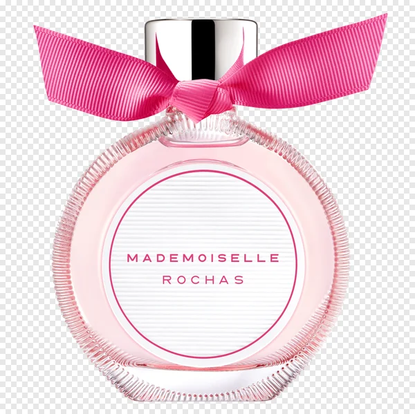 Download this exquisite Mademoiselle Rochas perfume bottle PNG image for free! Featuring a beautiful round glass bottle filled with a delicate pink fragrance, adorned with a charming fuchsia pink ribbon bow and a sleek silver cap. The label clearly displays 'MADEMOISELLE ROCHAS' in elegant pink text. The ribbed glass texture adds a touch of sophistication. Perfect for beauty blogs, e-commerce designs, cosmetic advertisements, graphic design projects, or creating stunning visuals related to luxury, femininity, and scent. This high-quality PNG offers a transparent background, making it easy to integrate into any creative work. Elevate your designs with this elegant fragrance image today!
