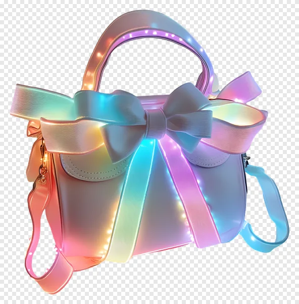 Discover this enchanting PNG image of a magical glowing handbag! Adorned with a magnificent iridescent bow and illuminated by a vibrant pastel rainbow glow, this unique fashion accessory pops against its black background. Its smooth, glossy texture and shifting, ethereal colors create a stunning, fantasy-like effect. Perfect for graphic design projects, presentations, digital art, social media posts, website banners, or creating whimsical themes. This high-quality, transparent PNG is ideal for adding a touch of glamour and vibrant sparkle to your creative work. Download this captivating iridescent handbag PNG for free today and elevate your designs!