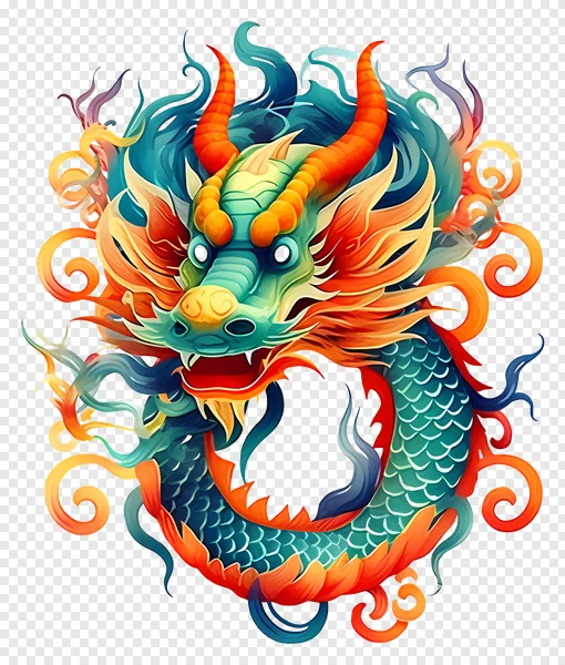 Tags: Chinese dragon Lunar New Year Year of the Dragon colorful cultural digital art dragon fantasy art flowing graphic design illustration legend mythical creature orange oriental red horns scales teal transparent PNG vibrant