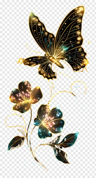 Discover this captivating PNG featuring an elegant golden butterfly and two beautifully glowing flowers. The intricate golden lines of the butterfly wings and floral petals are accentuated with sparkling, ethereal lights, creating a magical, luminous effect. Set against a deep black background, this design truly stands out, with subtle hints of blue and teal adding to its enchanting glow. Perfect for invitations, digital art projects, scrapbooking, web design, or adding a touch of luxury and fantasy to any creative endeavor. Download this high-quality, free PNG to elevate your designs with its dazzling beauty and sophisticated charm.