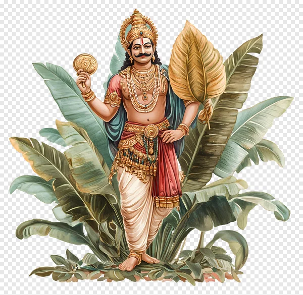 Discover this exquisite free PNG featuring a majestic Hindu King or deity, resplendent in traditional gold jewelry, an ornate crown (mukut), and a distinct mustache. This regal figure stands gracefully amidst lush tropical banana leaves, holding a decorative mirror and a large leaf, embodying rich Indian culture and mythology. With its transparent background, this high-quality cutout image is perfect for diverse creative projects – from cultural presentations and educational materials to graphic design, digital art compositions, and website enhancements. Download this vibrant, richly detailed illustration to add an authentic touch of Hindu heritage to your designs today!