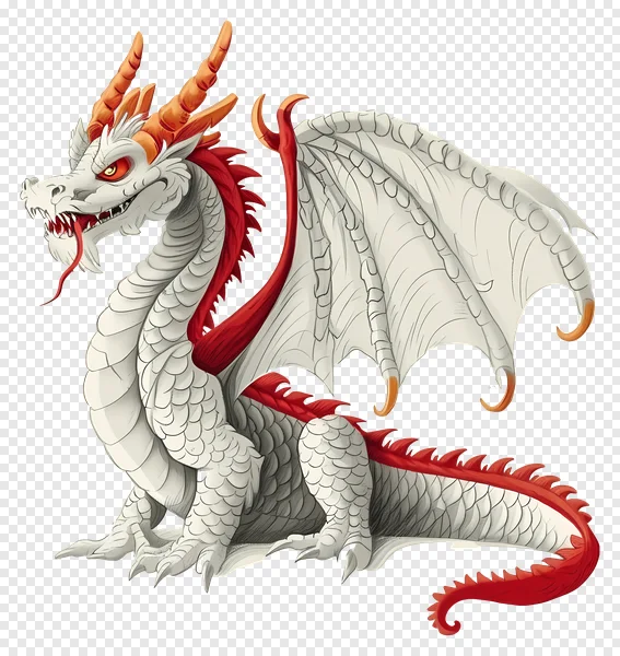 Unleash the power of fantasy with this stunning White Dragon PNG, perfect for igniting your imagination. This high-quality illustration features a majestic dragon with intricate white scales, striking red accents along its spine, underbelly, and wing membranes. Its piercing red eyes, sharp teeth, and flicking tongue give it an intense, fierce gaze, while prominent orange horns and wing claws add to its formidable appearance. Ideal for game development, digital art, graphic design, fantasy-themed projects, or adding a legendary touch to your creative works. Download this transparent PNG image for free and elevate your designs with this powerful mythical beast!