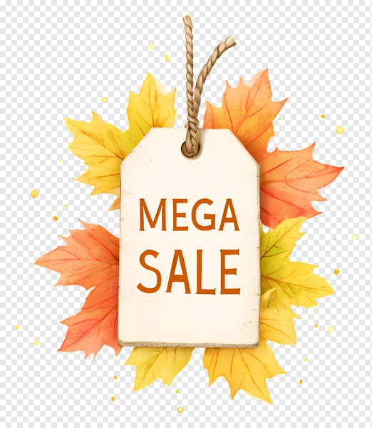 Download this stunning free Mega Sale Autumn Leaves PNG for your fall promotions! This vibrant image features a stylish cream-colored 'MEGA SALE' tag, complete with a rustic rope hanger, set against a beautiful backdrop of warm yellow, orange, and red watercolor maple leaves. Scattered golden speckles add a touch of sparkle. Perfect for seasonal discounts, advertising campaigns, social media posts, website banners, or print materials. The transparent background makes it easy to integrate into any design project. Capture the essence of autumn sales with this eye-catching and festive discount tag. Get yours now for free!