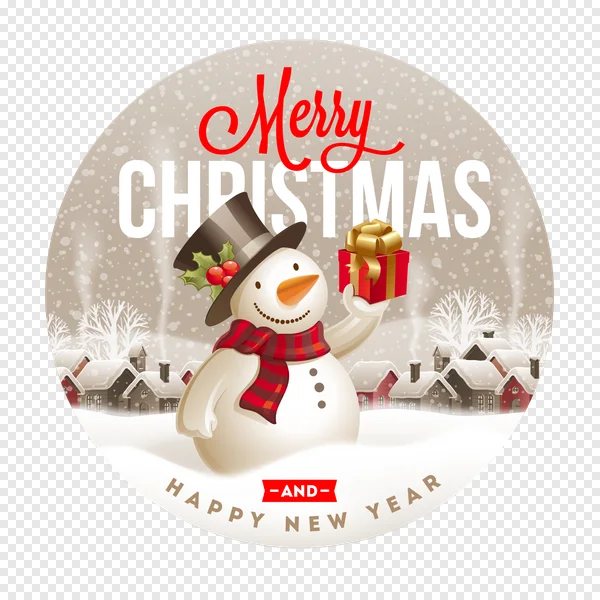 Download this charming Merry Christmas and Happy New Year snowman PNG for free! This festive illustration features a cheerful snowman in a top hat adorned with holly, a red striped scarf, holding a beautiful red gift box tied with a gold ribbon. Behind him, a quaint snowy winter village is nestled under falling snow, creating a warm holiday atmosphere. Perfect for holiday cards, digital greetings, social media posts, invitations, scrapbooking, and any creative project needing a touch of seasonal cheer. Get your transparent PNG now and add warmth to your designs for both Christmas and New Year celebrations!