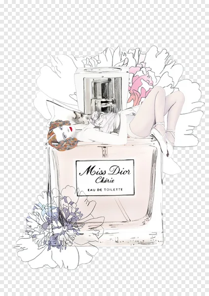 Download this stunning free Miss Dior Cherie perfume PNG featuring an elegant fashion illustration. A chic reclining figure in ballet shoes rests atop the iconic Eau de Toilette bottle, surrounded by delicate floral line art. Perfect for beauty blogs, fashion designs, social media graphics, scrapbooking, or adding a touch of haute couture to your creative projects. Get this high-quality transparent PNG today!